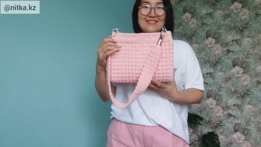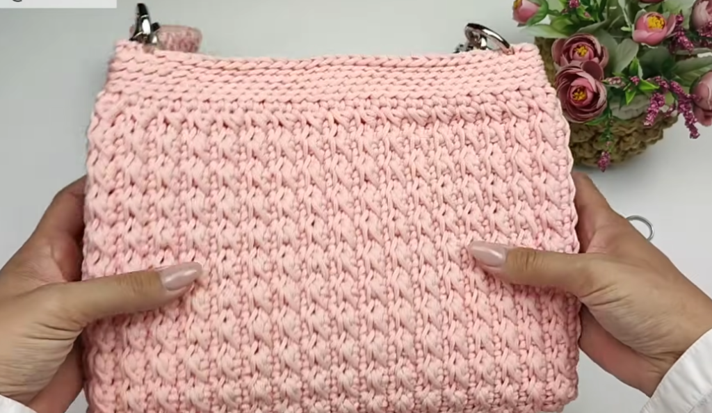 - Show the finished crochet shoulder bag.