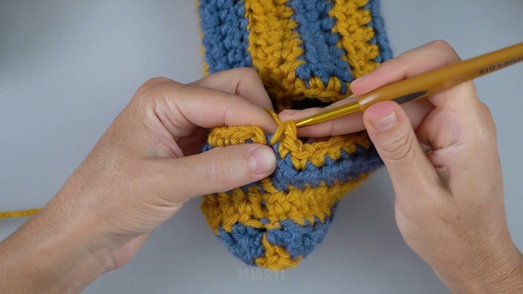 - Row 2β10 (or until piece measures about 7″ long): HDC in each stitch across. Chain 1, turn. π‘ This forms the sole and top of the slipper. Adjust length to fit your foot.