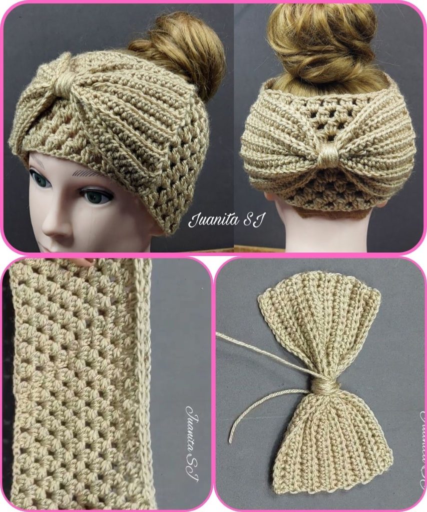 - Instead of making a separate bow, make the center portion of the band slightly gathered using a tighter stitch or elastic wrap. Then crochet the rest as usual.