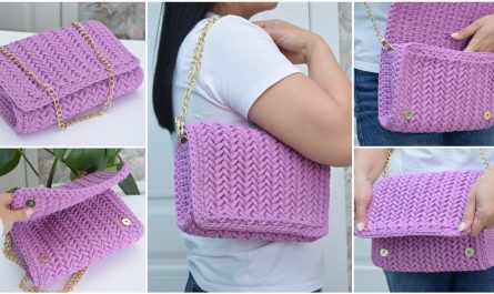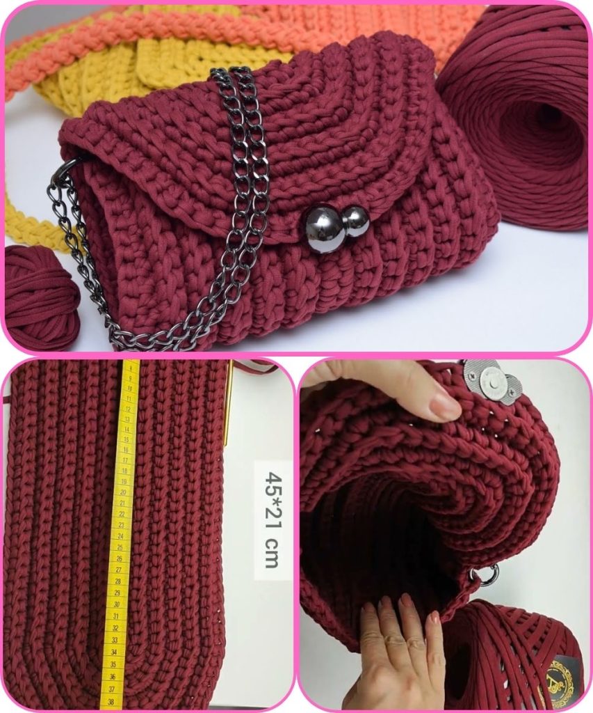 You’ll make a rectangular or oval-shaped bag body with a round flap that features a convex (raised or puffed) stitch pattern — such as bobbles, popcorn, or front-post stitches — for beautiful texture. The bag can be finished with a lining and a strap.