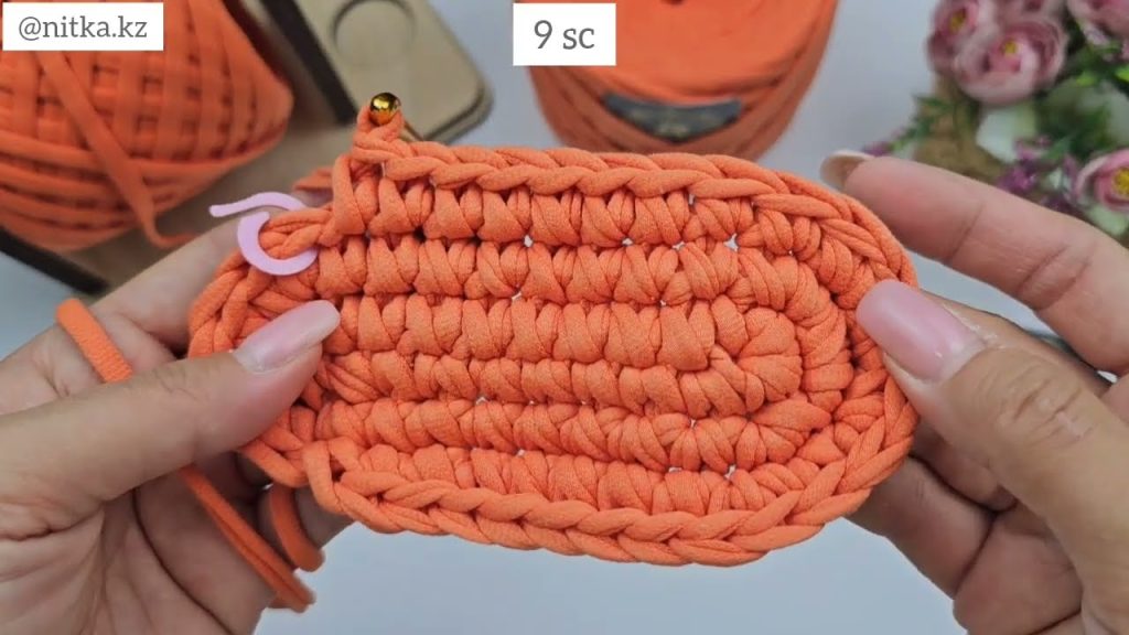 - On the next round, crochet hdc into each chain to strengthen the handles.