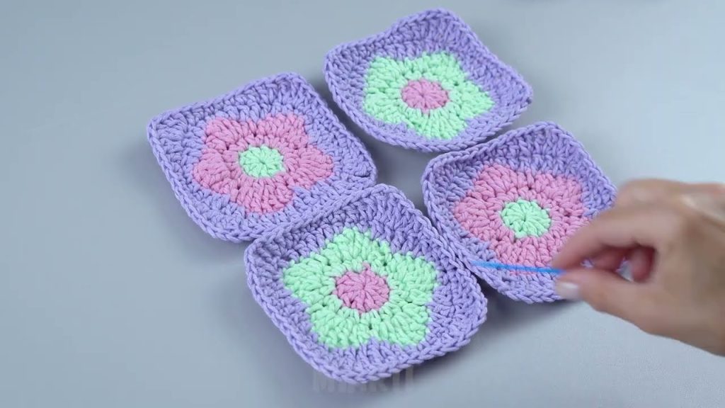 The bag is made by connecting multiple granny squares. Here’s an easy granny square pattern: