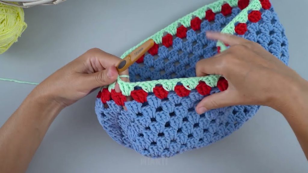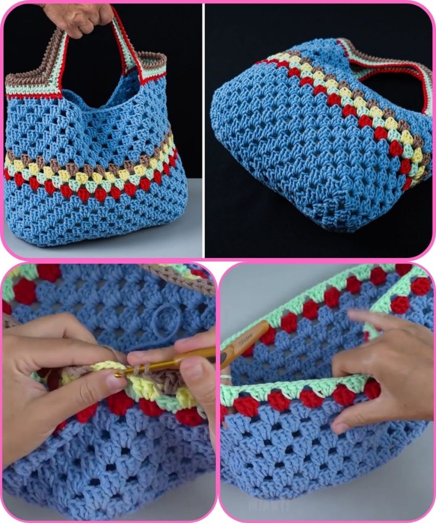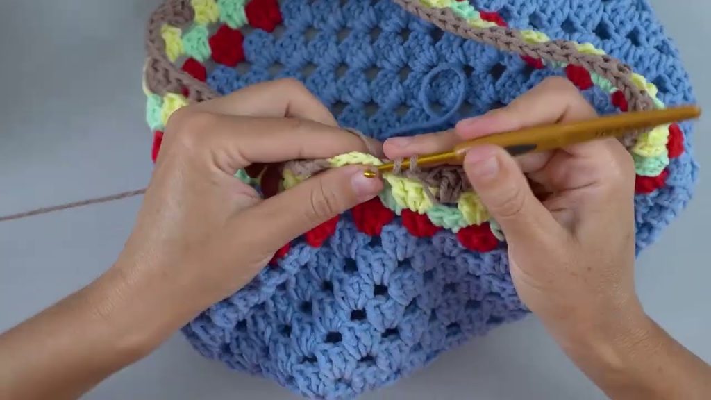 - Single crochet around the entire bag, placing single crochet stitches into the chains of the handles.