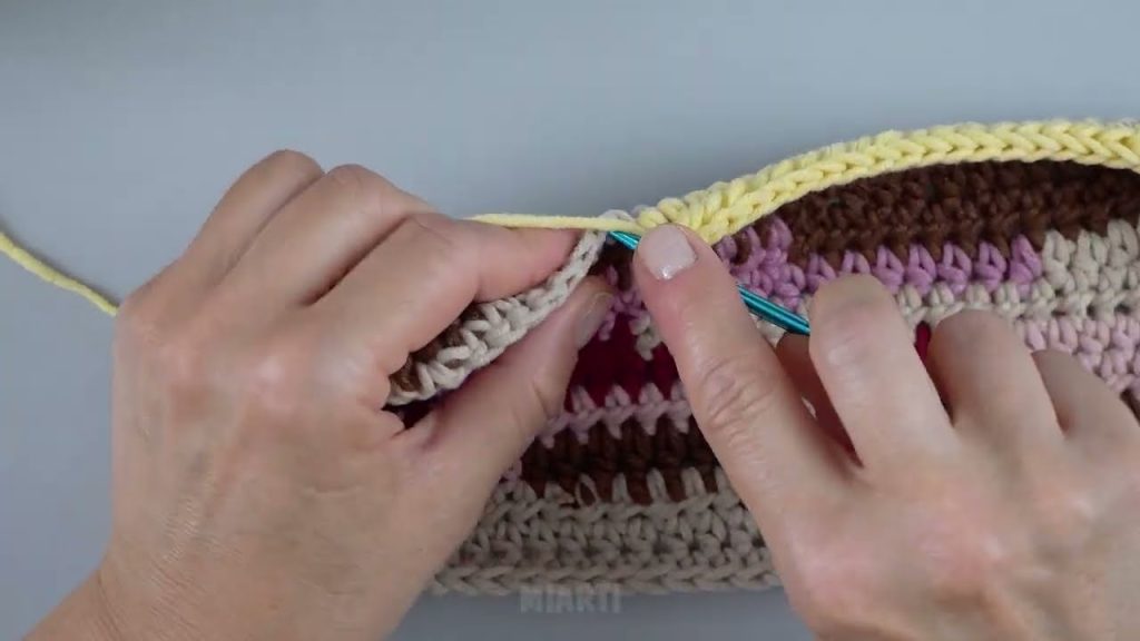 - Work 1–2 rounds of sc around the top edge, including sc into the handle chains
