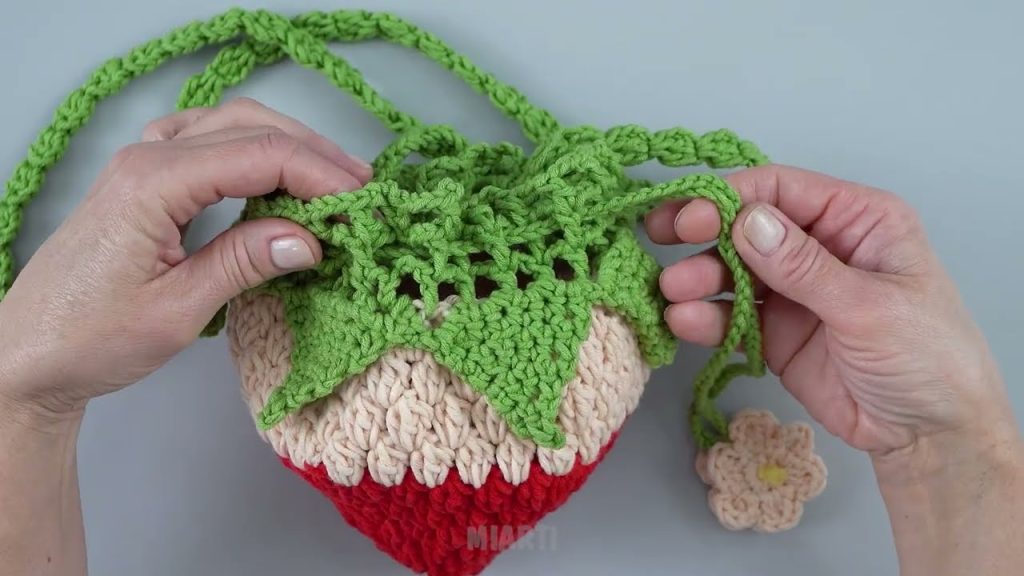 Create leaf shapes by crocheting chains and slip stitches or using simple leaf patterns. These leaves will form the strawberry crown and also help close the bag slightly at the top.