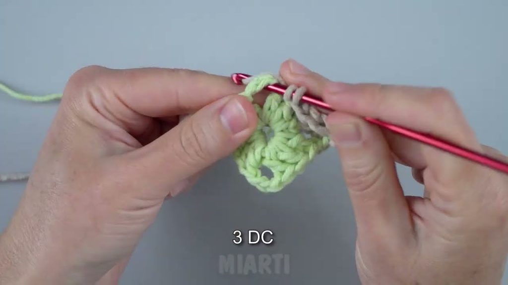 - Ch 3 (counts as first dc), dc 2 into ring, ch 2, dc 3, ch 2 three times.