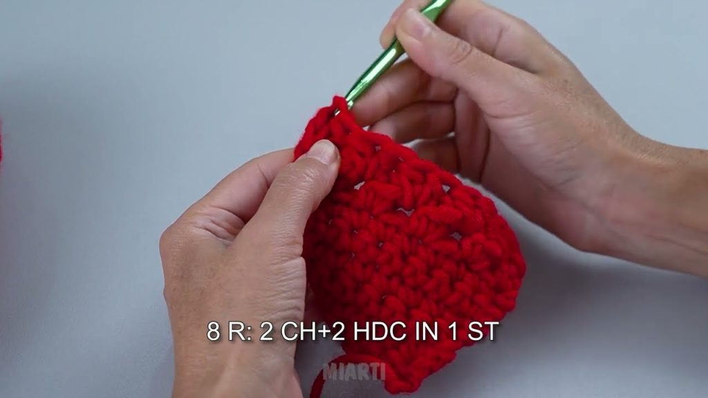 - Row 1: HDC in 3rd chain from hook, HDC across. Turn.