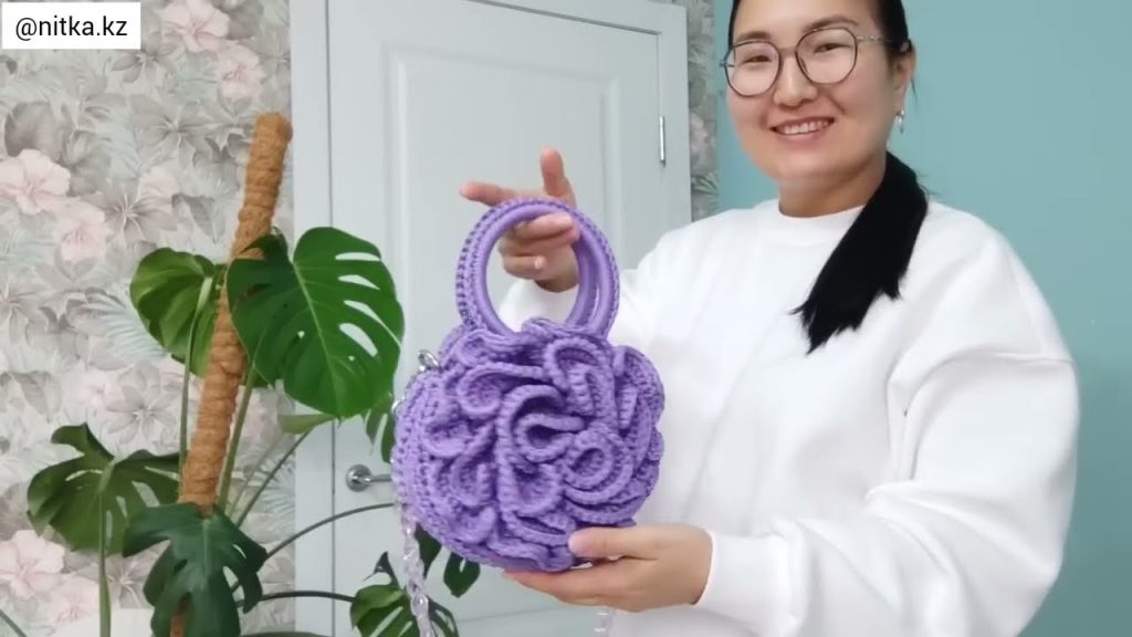 This beautiful round floral handbag is designed to resemble a blooming peony flower. It’s made using crochet techniques and polyester cord to create a durable and elegant accessory. Perfect for spring and summer, this bag combines aesthetics with practicality.